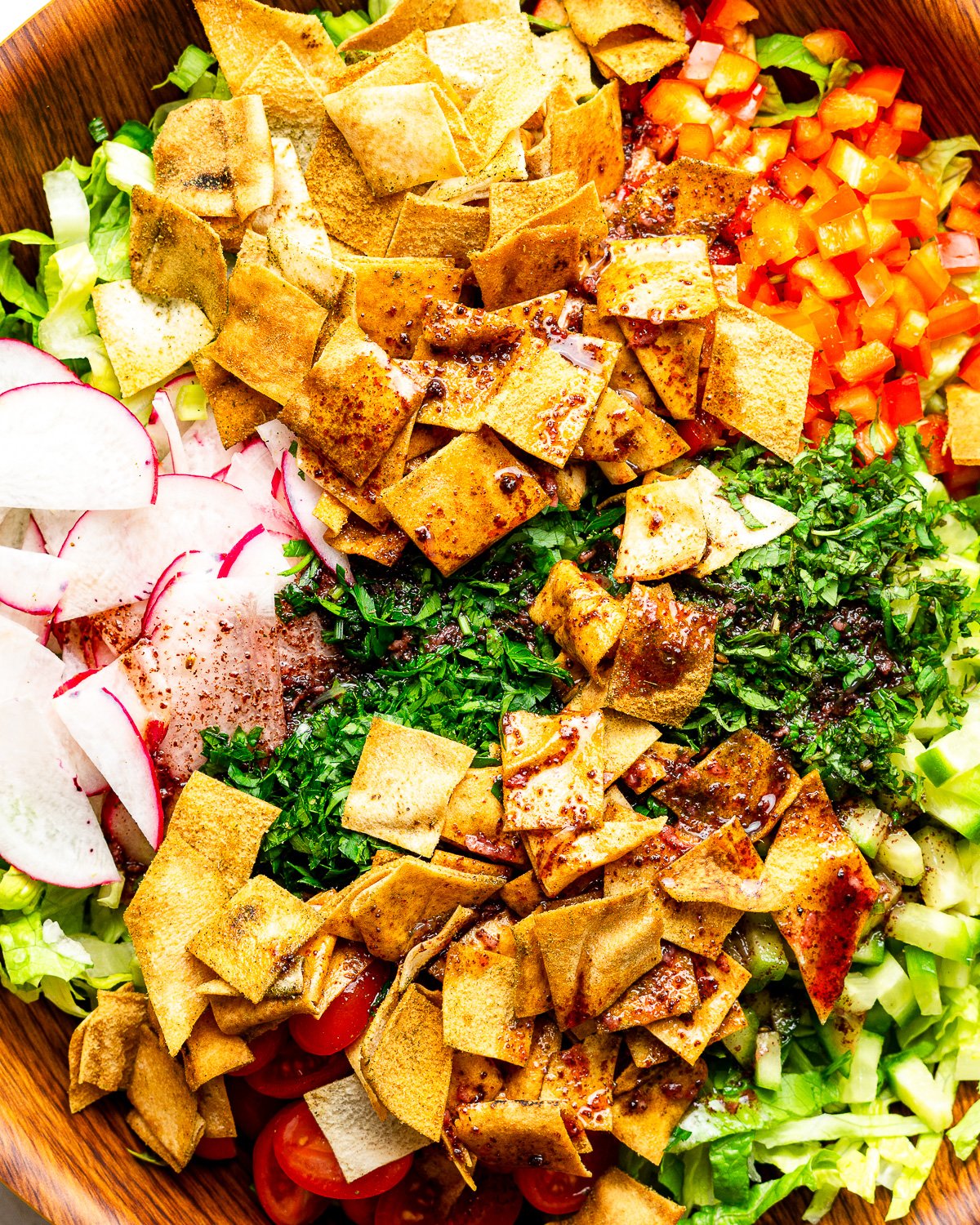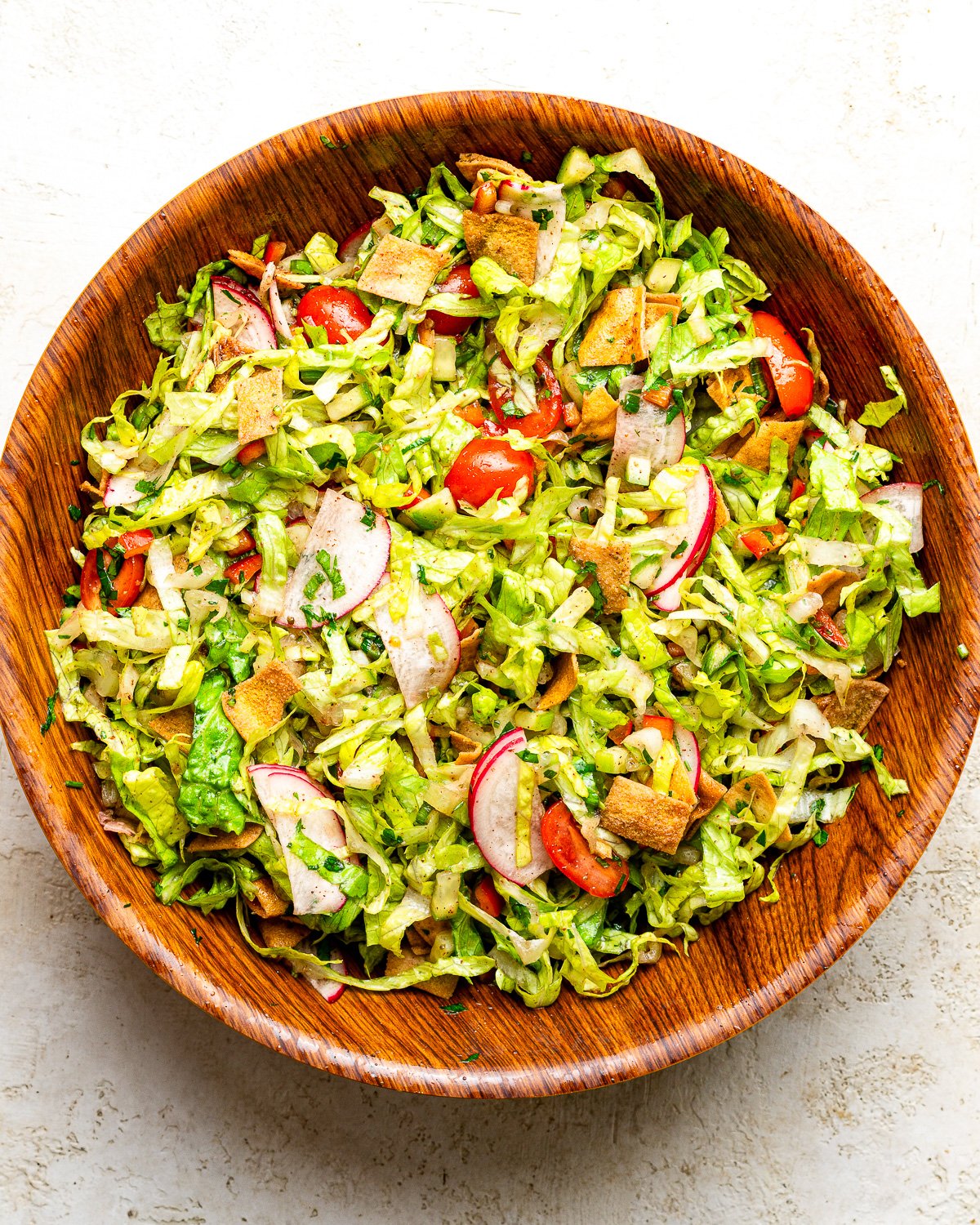 Fattoush is a traditional Lebanese salad that originated as a way to use leftover pita bread. In Levantine kitchens, nothing goes to waste. Stale bread was toasted or fried and tossed with whatever fresh vegetables were in season.