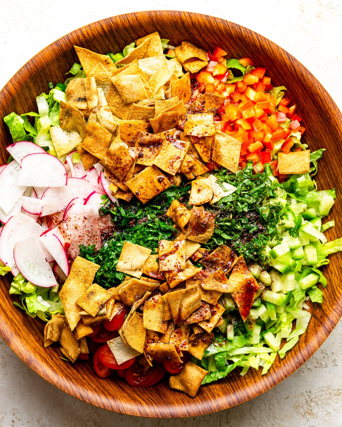 - Radishes: Radishes are one of the defining vegetables in an authentic fattoush salad recipe. They add peppery bite and signature crunch. Their slight sharpness balances the sweetness of tomatoes and pomegranate molasses.