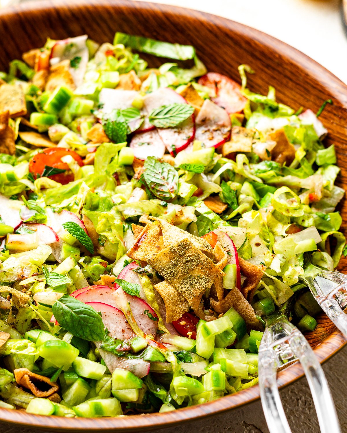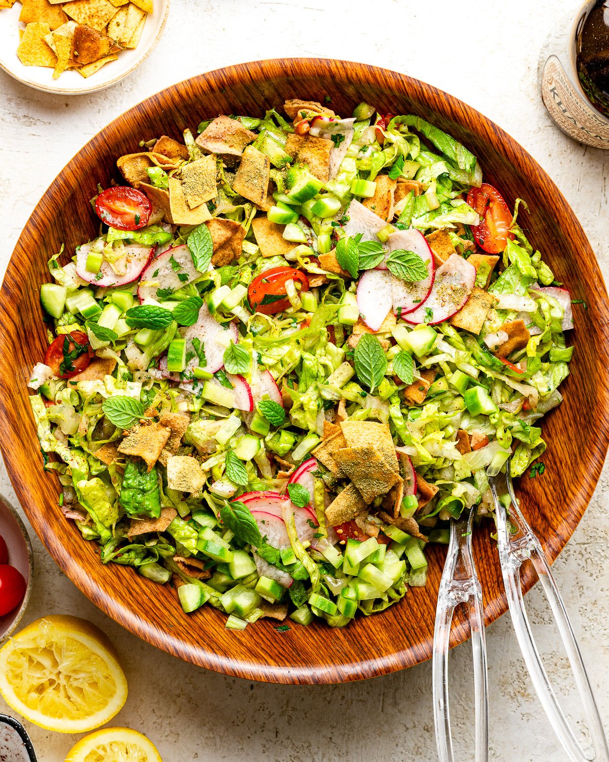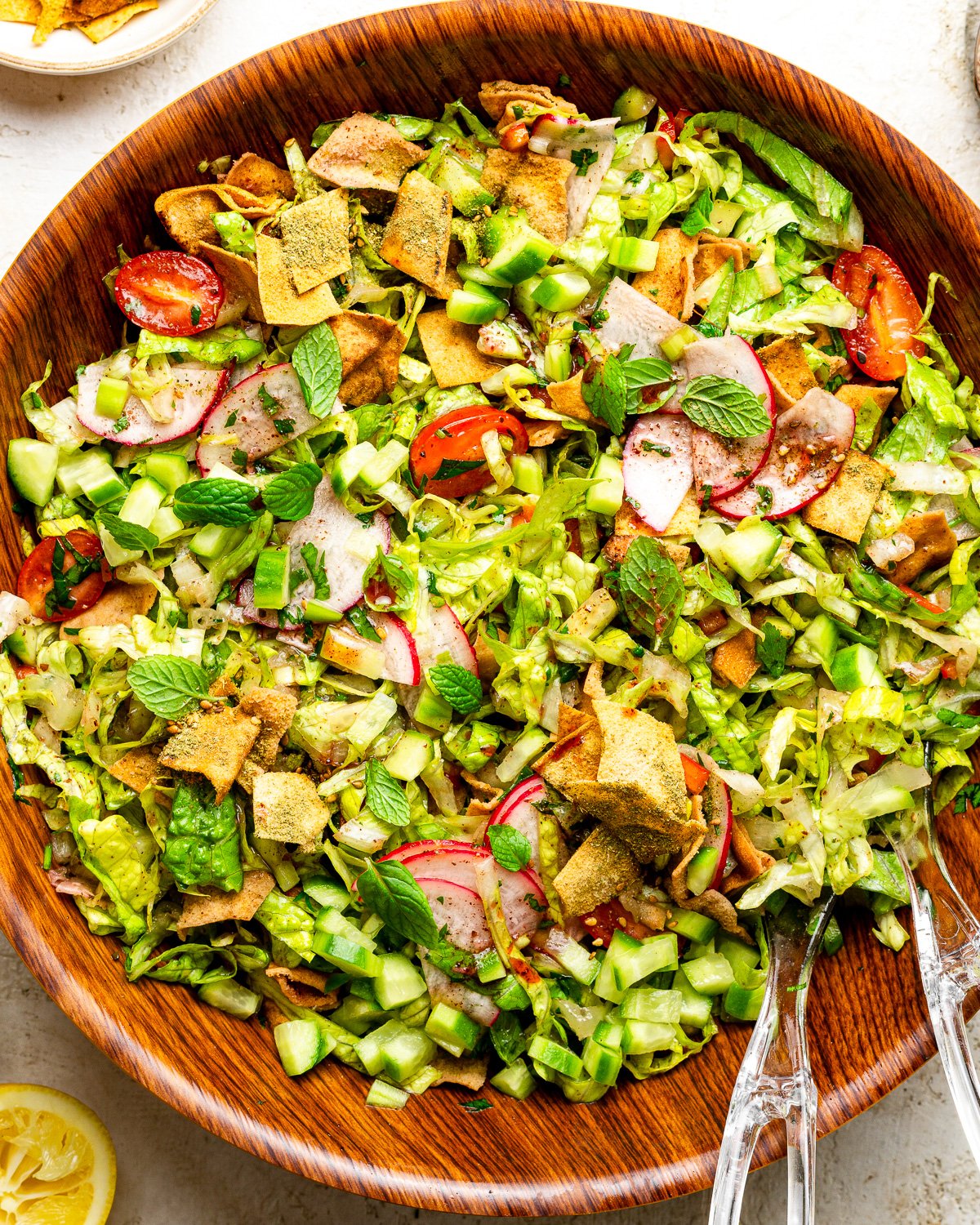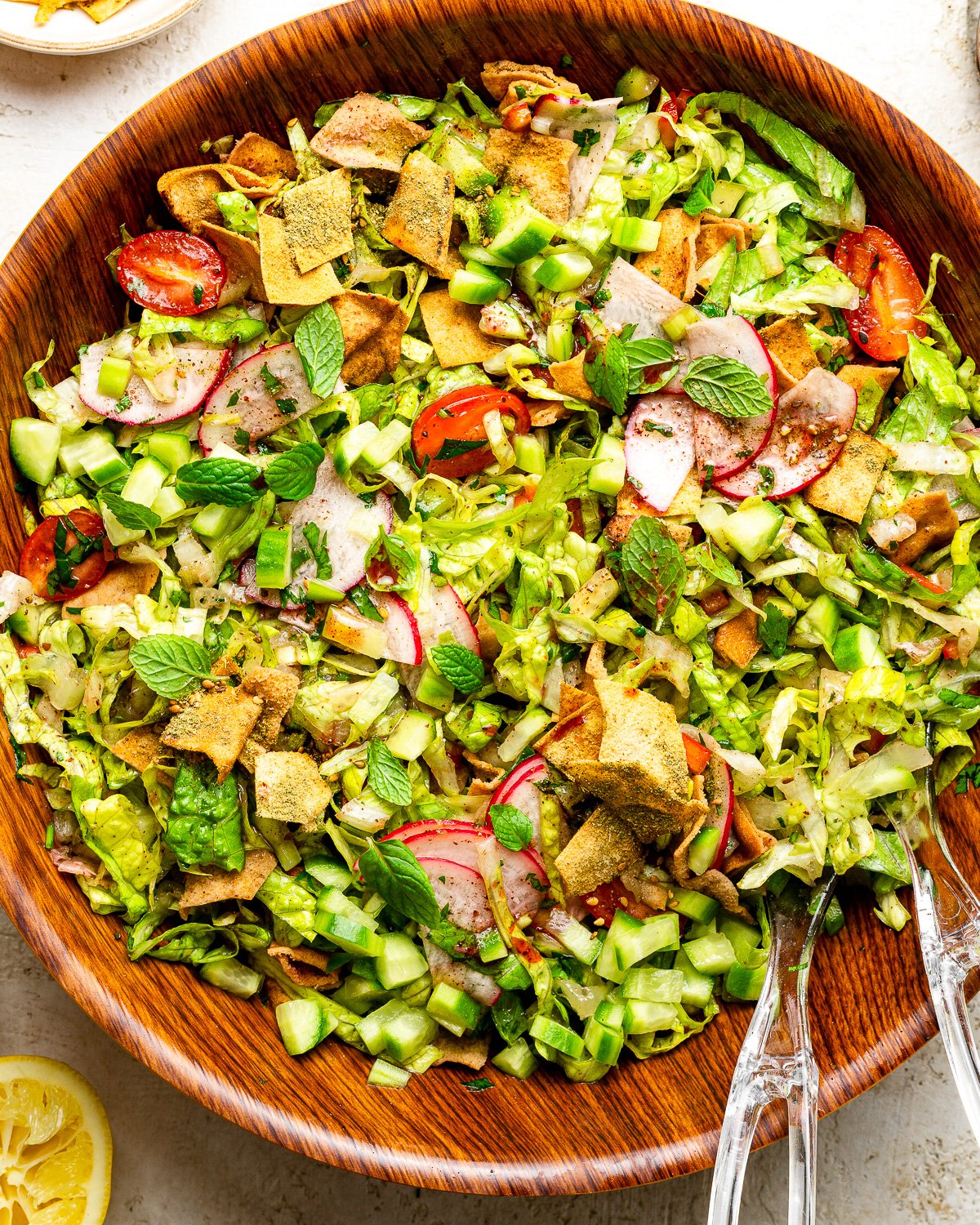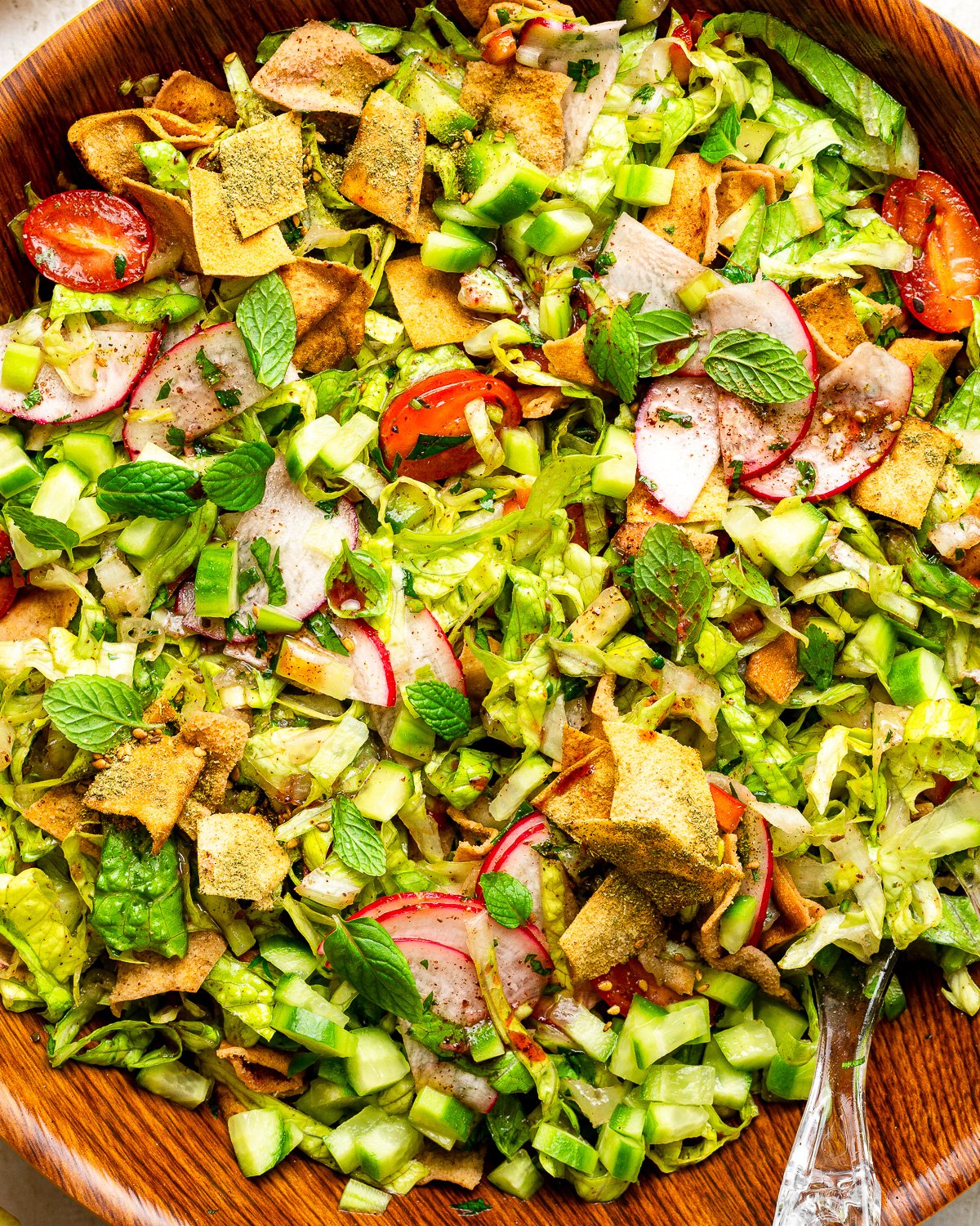 - Fresh Mint: Mint is a key herb in Lebanese cuisine. It brings brightness and freshness that defines a true authentic fattoush salad recipe. Do not skip it, dried mint is not a substitute here.